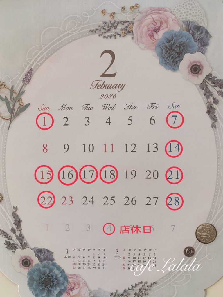 ラララブログ 2月のスケジュールです♪ cho83674 2026年1月28日 こんにちは♪ 来月のカフェスケジュールです。 2月はお試しで初めて日曜日営業いたします! 8日(日)です。 そして11日と23日の祝日も営業します。 平日お仕事のお客様、ぜひご利用下さいね🍽️🫖🩶 16〜18日は所用の為お休みさせていただきます🙏