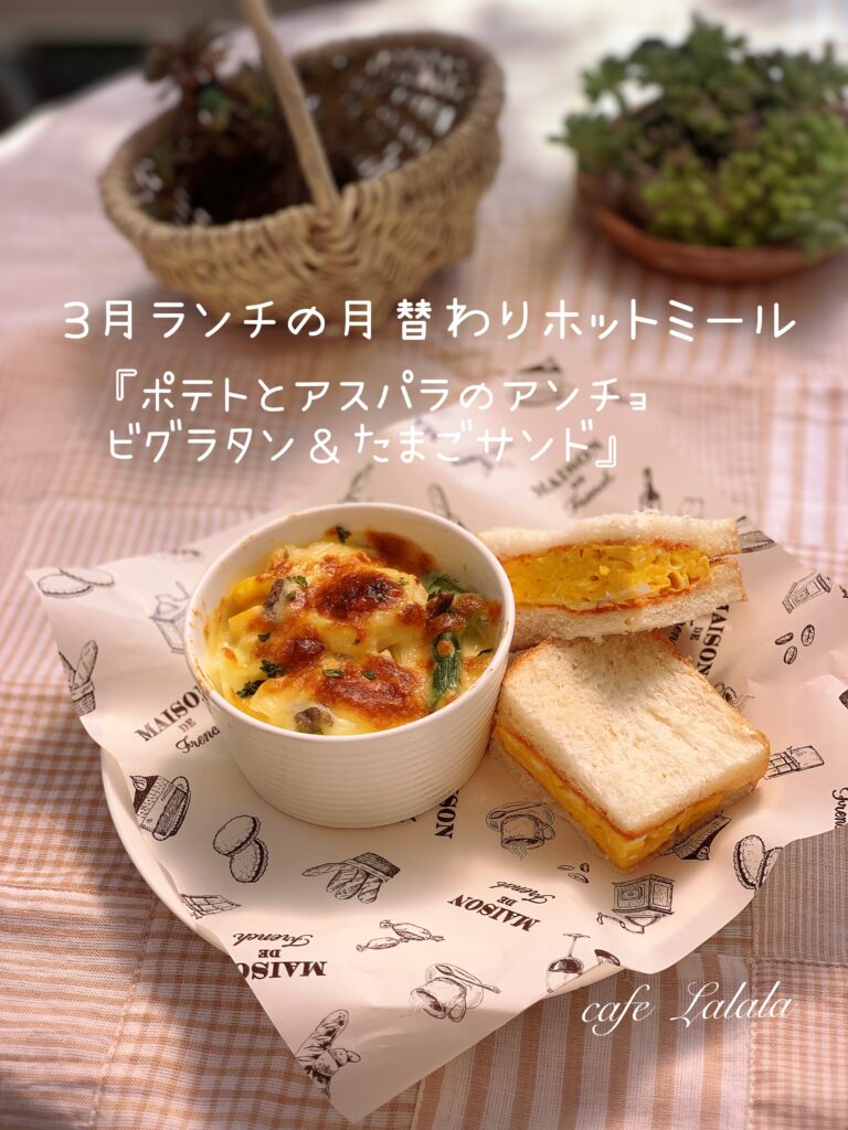 月替わりホットミールは『ポテトとアスパラのアンチョビグラタン&たまごサンド』です。