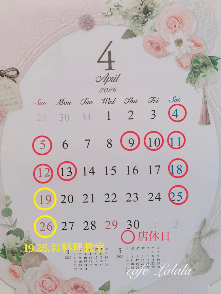 ラララブログ 4月のスケジュールです♪ cho83674 2026年3月25日 こんにちは♪ 来月のスケジュールです。 4月は平日お休みあります🙏 29日の祝日は営業します。 19日、26日はお料理教室します。 詳細はまたお知らせしますね。 来月もどうぞよろしくお願いします🥰